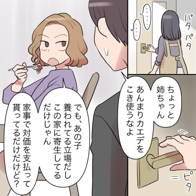 ダイニングのドアを開けようとしたカエデさんの耳にユウタさんと義姉の会話が聞こえてきました。「ちょっと姉ちゃん。あんまりカエデをこき使うなよ」ユウタさんがそう言うと、義姉は「でも、あの子養われてる立場だしこの家に寄生してるだけじゃん。家事で対価を支払ってもらってるだけだけど?」と平然と言い放ちました。