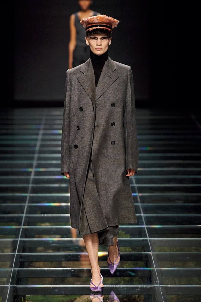 プラダのAWコレクションで見たルックがとても素敵で、そこからインスピレーションを得たのが、きちんと感のあるオールグレースタイルに、足元にだけ色を差してハズす着こなし。コーディネートに色を取り入れるのが苦手という人も、足元なら真似しやすいはず。