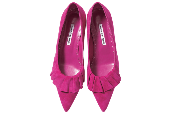 フリルディテールもフューシャピンク&スエードなら大人に。[ヒール3㎝]¥166,100(マノロ ブラニク/ドゥロワー 青山店)