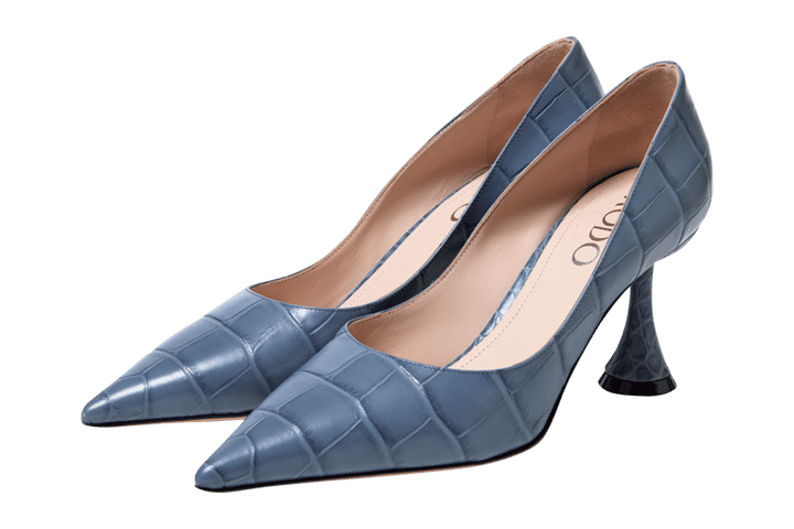 落ち着いたブルーのクロコダイル柄、ヒールのフォルムなども印象的。[ヒール8㎝]¥128,700(ロド/メゾン・ディセット)