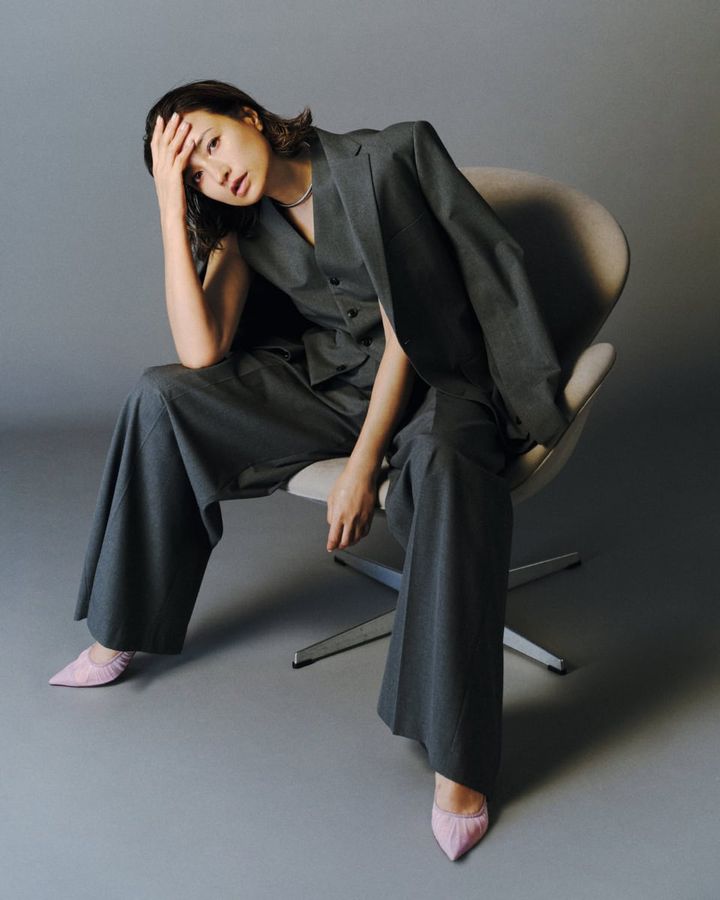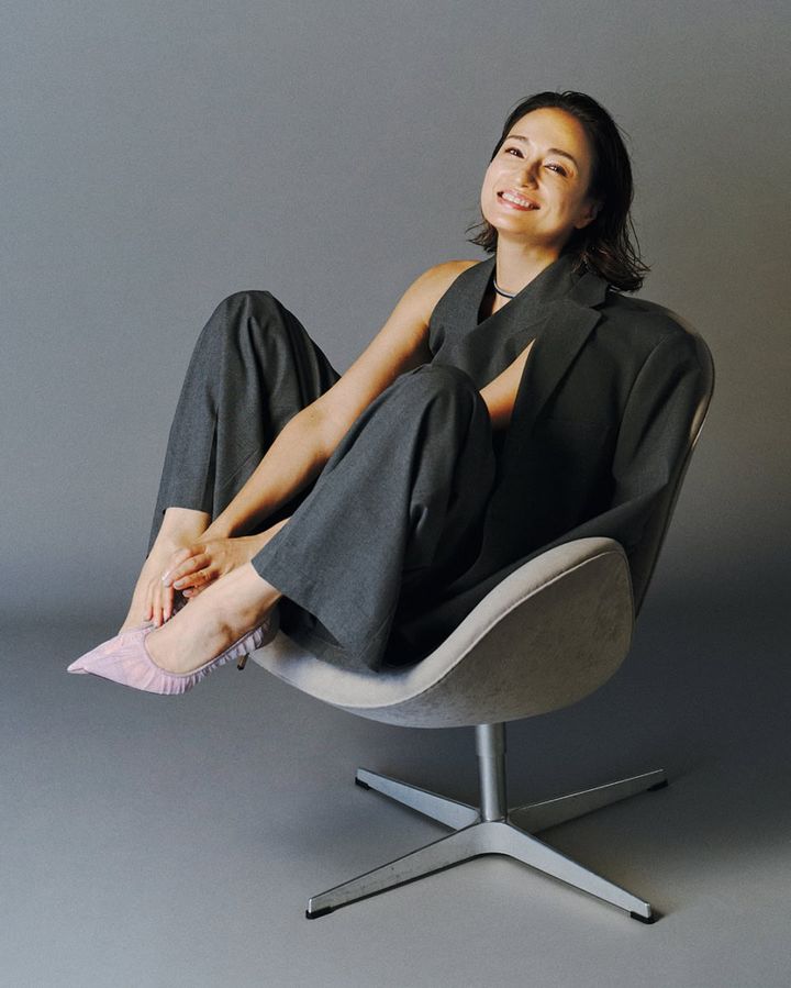 シューズ[ヒール6.5㎝]¥138,600(ジミー チュウ)、ジャケット¥93,500、ジレ¥35,200、パンツ¥46,200(全てハイク/ボウルズ)、ネックレス¥131,090(トムウッド/トムウッド 青山店)