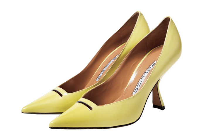 カーブヒールが今季らしい一足。ベージュ感覚ではけそうなマイルドなイエローが◎。[ヒール9㎝]¥75,900(ペリーコ/アマン)
