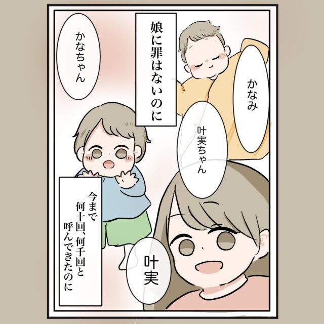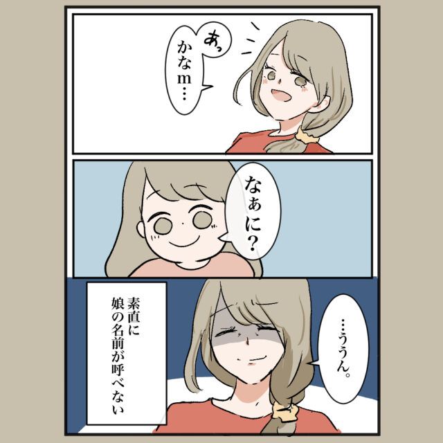 それから時間が経ったある日のこと、「あっ、かなm・・」「なぁに?」娘の名前を呼びかけてためらうママは、「・・ううん」と答えたものの、素直に娘の名前が呼べないことについて、違和感を感じていました。