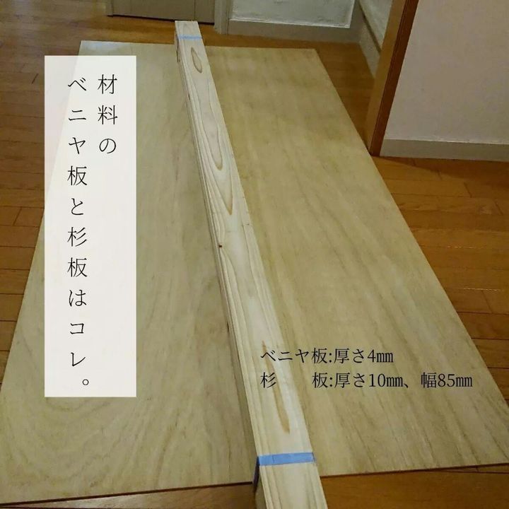 厚さが4mmのベニヤ板と厚さ10mmの杉板を使います。杉板の幅はお好みで選んでください。ベースのベニヤ板を必要な大きさにカットしてから、杉板をベニヤ板に合わせてカットしましょう。