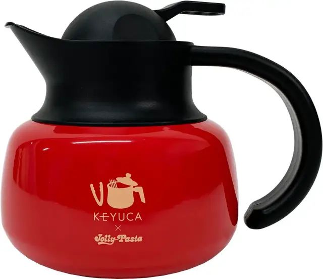 暖かみのある赤色をベースに、ジョリーパスタらしいパスタ鍋とトングのイラストをあしらった保温・保冷機能の付いたポットです。