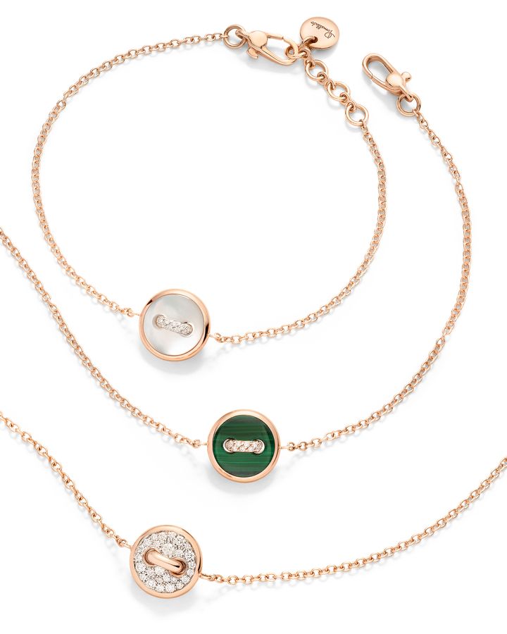 ブレスレットは、ネックレスと同じカラーリング。リバーシブルブレスレット「ポムポムドット」上から〈K18ローズゴールド×ホワイトマザーオブパール×グレーマザーオブパール×ダイヤモンド〉¥308,000〈K18ローズゴールド×マラカイト×ホワイトマザーオブパール×ダイヤモンド〉¥341,000〈K18ローズゴールド×ダイヤモンド×ホワイトマザーオブパール)¥495,000(すべてポメラート/ポメラート クライアントサービス