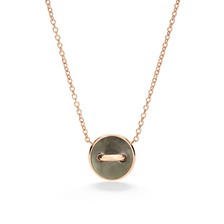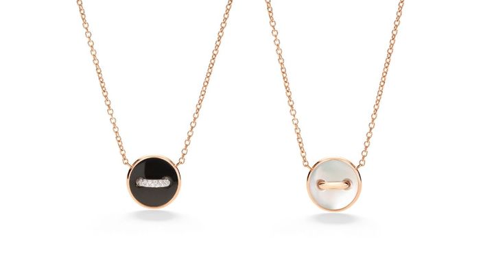 表裏にホワイトとグレーのマザーオブパールが配されたデザイン。淡いカラーの組み合わせは、どんなスタイルにも取り入れやすくさまざまなシーンに活躍。リバーシブルネックレス「ポムポムドット」〈K18ローズゴールド×ホワイトマザーオブパール×グレーマザーオブパール×ダイヤモンド〉¥341,000(ポメラート/ポメラート クライアントサービス)