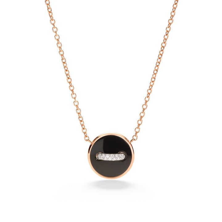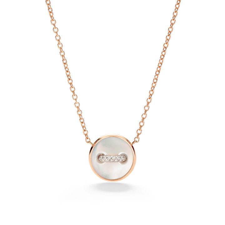片面にダイヤモンドがびっしりと配されたデザイン。裏側はホワイトマザーオブパールで、エレガントな雰囲気が楽しめます。リバーシブルネックレス〈K18ローズゴールド×ダイヤモンド×ホワイトマザーオブパール〉¥616,000(ポメラート/ポメラート クライアントサービス)