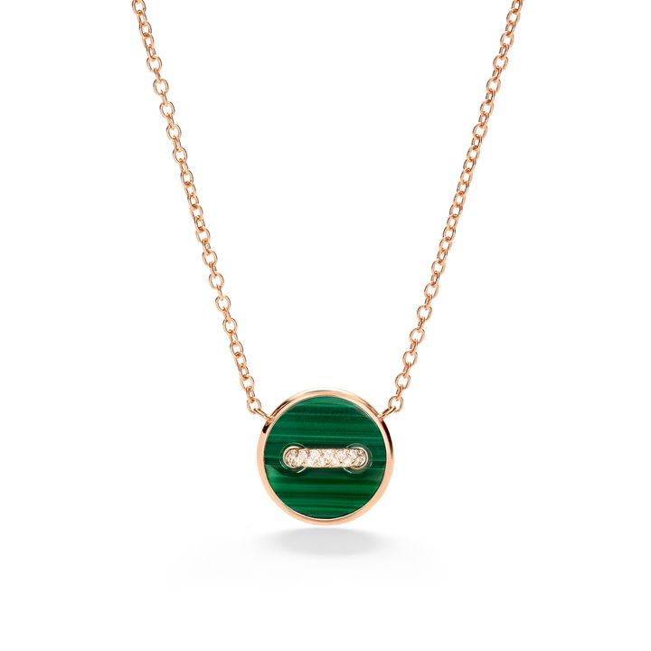 グリーンのマラカイトが印象的。裏側にはホワイトマザーオブパールが配された強弱のコントラストが美しいデザイン。リバーシブルネックレス〈K18ローズゴールド×マラカイト×ホワイトマザーオブパール×ダイヤモンド〉¥385,000(ポメラート/ポメラート クライアントサービス)