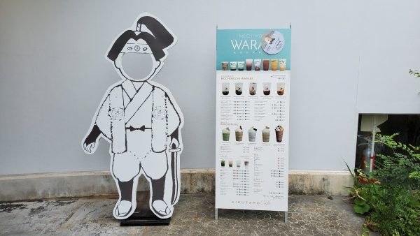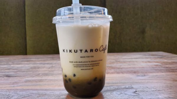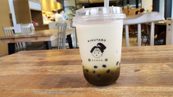 店内を撮影していると、「ほうじ茶ミルクわらび」がとどきました。ほうじ茶とミルクのツートーンとつぶつぶのわらびもちがかわいいビジュアル。カップのきくたろうアイコンがキュート。飲んでみると濃厚なほうじ茶のコクと香りにまろやかなミルクで甘すぎない。そして黒糖味のわらびもちがストローからするするっと口に入ってきます。もちもちだけど柔らかく飲みやすい!