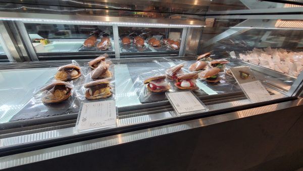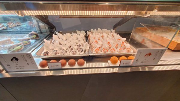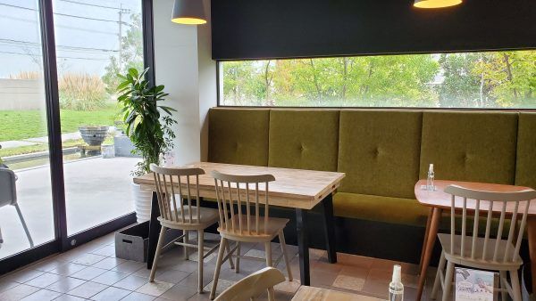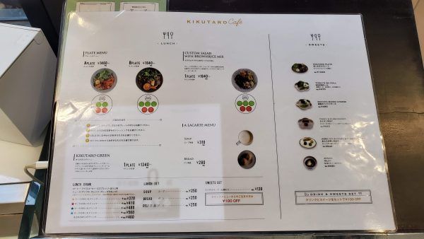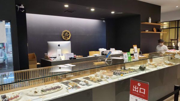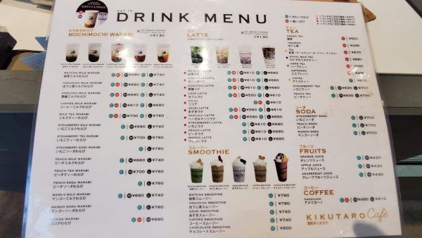 店内に入ると、シックな内装に、伝統の和菓子や、季節によって種類が変わる華やかな生どらやきがズラリ。きくたろうの顔のデザインが入った袋に詰められた”きくたろう饅頭”も愛らしいルックス。カフェも店内入って左側にあり、案内された後、席に設置してあるQRオーダーで注文を行います。