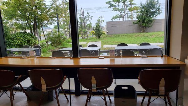 景観を楽しみながらくつろぐことのできるカフェ店内の席で「KIKUTARO cafe」のオーダーをします。ランチもいただけるのですが、今回は初志貫徹でもちもちわらびドリンクの「ほうじ茶ミルクわらび」を注文。
