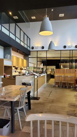 「KIKUTARO cafe」は、JR日豊本線朽網(くさみ)駅の空港口から徒歩約15分。海が近い県道25号線沿いにあります。先日紹介した「sweets shop FAVORI PLUS(スイーツショップファボリプリュ)」からも徒歩1分ほどの距離。ダークグレーの看板とスタイリッシュな建物が目印。広い駐車場も完備。