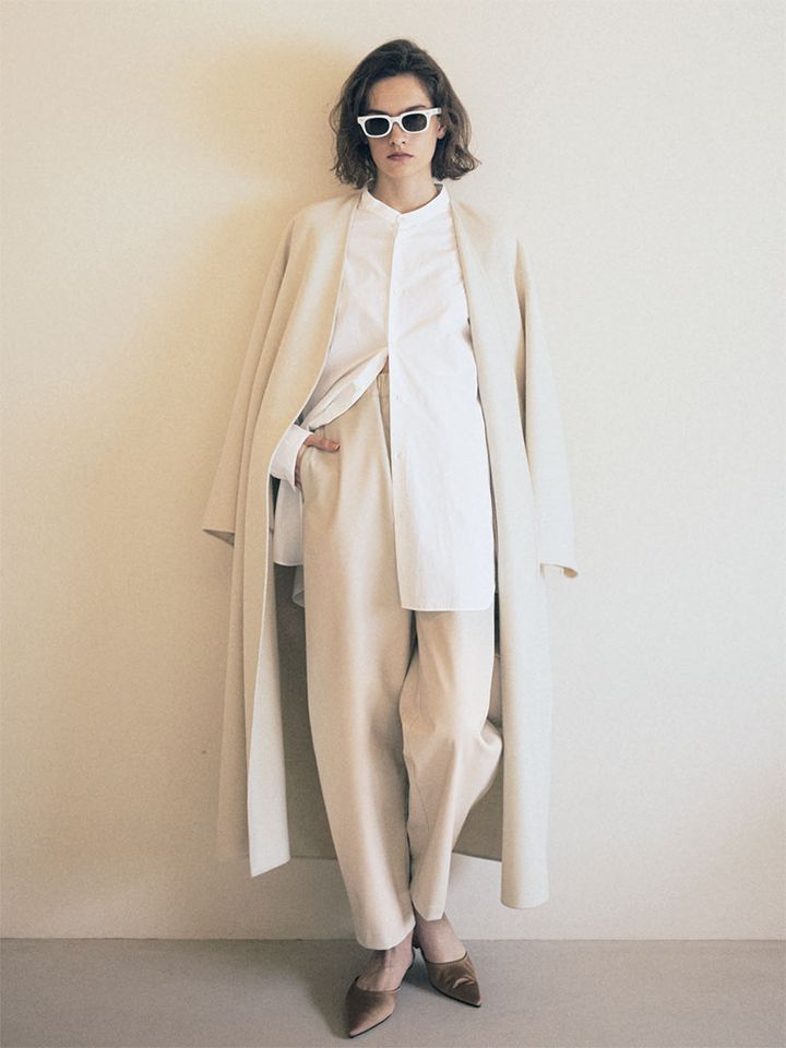 シンプルなワードローブの核を担う白シャツのえりをバンドカラーに更新。パリッとした白シャツが持つキレはそのまま、着回しが長続きする新たな魅力をコーディネートを通してお届け。