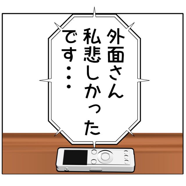 後輩女性ふり子さんに逆恨みされセクハラ、パワハラをでっちあげられた良し男さんは、部長と課長を交えて面談。偽りの証言ばかりするふり子さんに対し、良し男さんはふり子さんに呼び出されたときの2人の会話を録音したボイスレコーダーを証拠として提出します。課長がみんなの前でボイスレコーダーを再生すると、「外面さんが最近私を避けてる理由って・・・」とふり子さんの声が流れてきました。