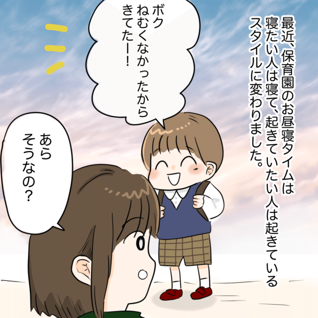 最近、保育園のお昼寝タイムは寝たい人は寝て、起きていたい人は起きているスタイルに変わりました。