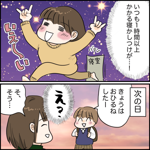 息子の言葉に母は一喜一憂。園で「お昼寝した」「起きてた」に寝かしつけの1時間がかかってる!|ホッターの子育て絵日記