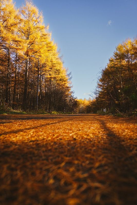 両脇にカラマツが群がるようにそびえ立ちます。日の光を浴びて、景色全体が黄金色に染められていました。