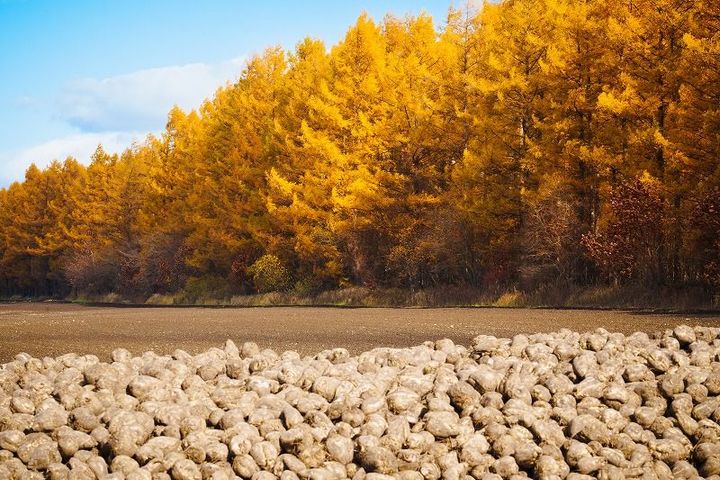 この時期に車で走っていると、色あざやかな黄金色に目が行きます。カラマツが、広大な畑の景色に彩りを加えています。
