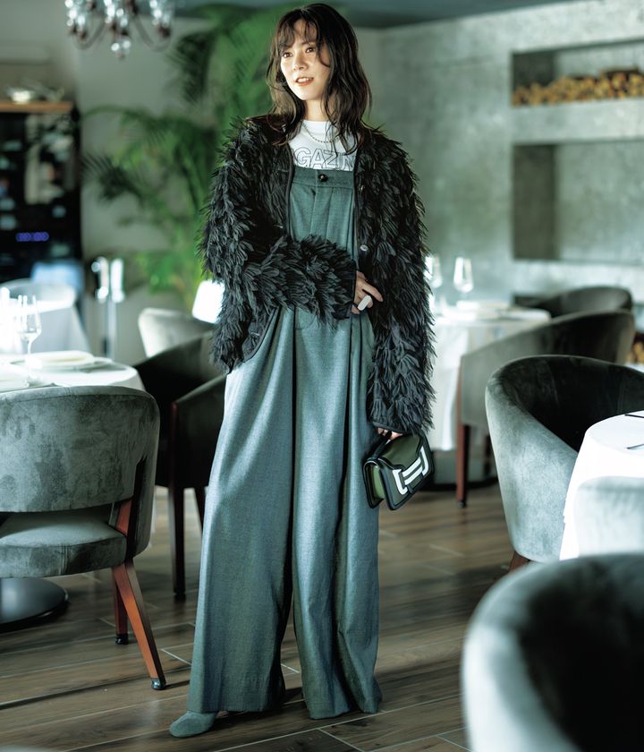 ランチの日はチュール素材で軽やかに羽織れる黒のフェザーカーディガンを主役に。映えカーデを際立たせたいから、Tシャツ×オールインワンを合わせてちょっとボーイッシュに仕上げて。オンナっぽさとの緩急がより上級者見えのオシャレを確立。