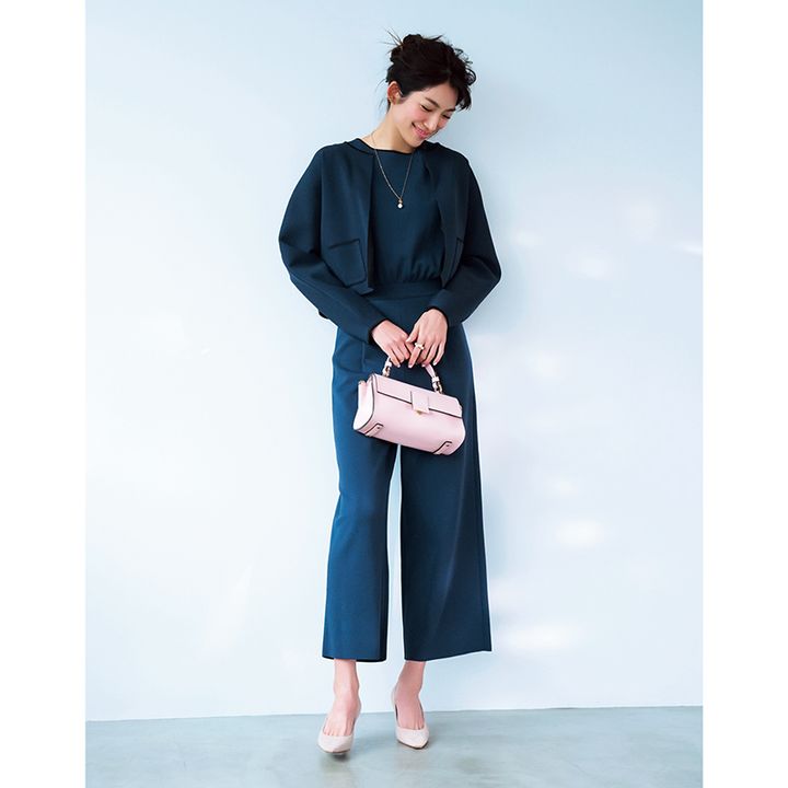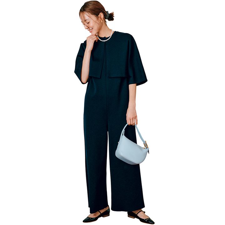 オールインワン×短丈ジャケットで 王道ネイビーも今どきオシャレに。 伸縮ニットで長時間でも楽ちん