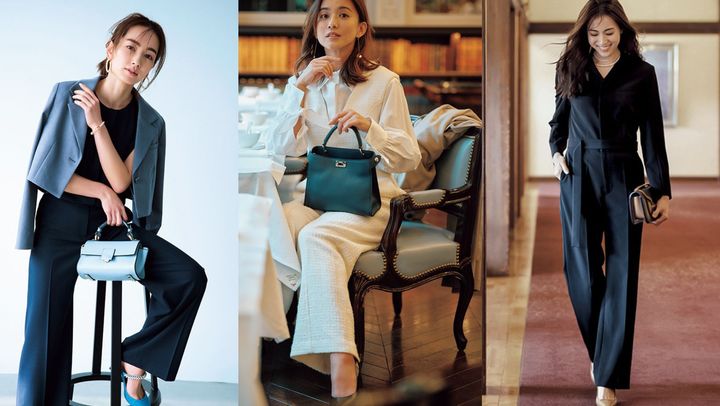 モード見えするオールインワンは 白のツイードで上品な華やかさを。 黒小物できちんと感をプラス