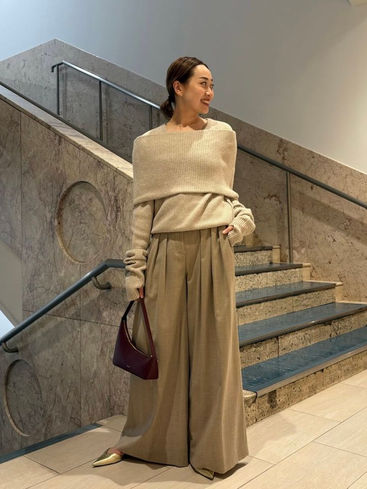 「フェミニンなニットに対して、落ち感のあるウールのタックワイドパンツを合わせて、さらに甘くなり過ぎないようにワントーンでスタイリングしました。また、2024年の秋冬よりデビューしたCOLUMNのボルドーのミニバッグを取り入れて、華やかさをプラスしました」