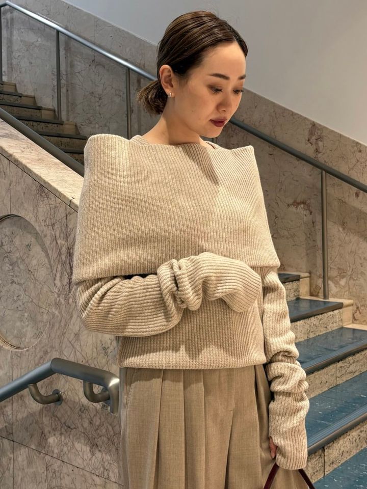 「ニットはスヌードが取り外しできるので、単体でも使えます。また、袖がかなり長く親指を入れる穴もあるので、アームウォーマー感覚で着ることができて◎。カシミア混のため肌触りもよく、着心地も抜群です! COLUMNのニットは、フェミニンでありながらも少しモードなデザインが気に入っています」ニット¥63,800(コラム/エストネーション)