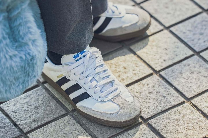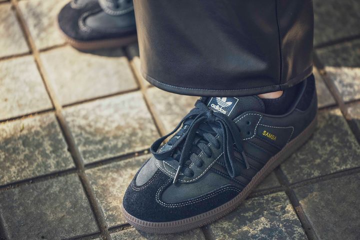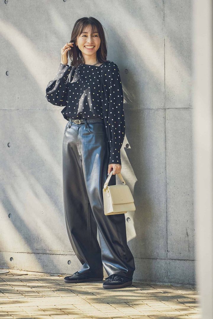 トレンドのレザーパンツは、丸みのある曲線フォルムでハードな印象に偏り過ぎず、甘ブラウスも難なく受け止める包容力が魅力。足元はクラシカルなムードが漂うスウェード素材のadidasサンバで他と差をつけて、リラクシーな印象に仕上げています。