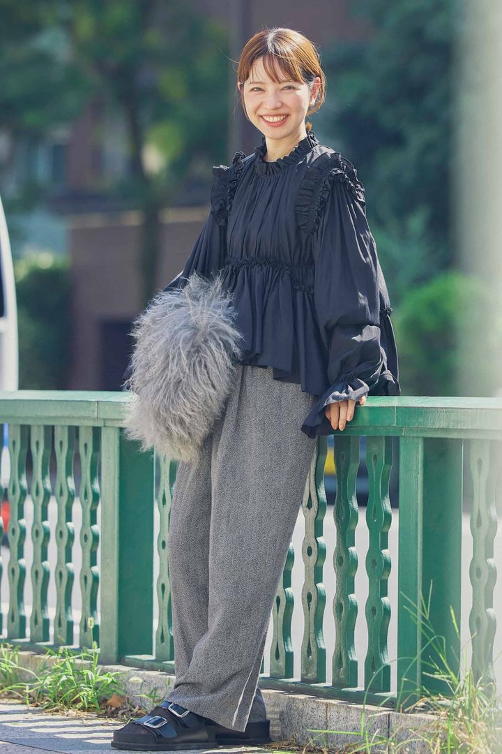 フリルやシャーリングなど甘要素たっぷりのボリュームブラウスに、落ち感のあるシンプルなパンツを合わせた王道甘ニッシュコーデ。ブラックやグレーなど全てベーシックカラーで統一すれば、ほんのりモードで大人っぽい印象にまとまります。