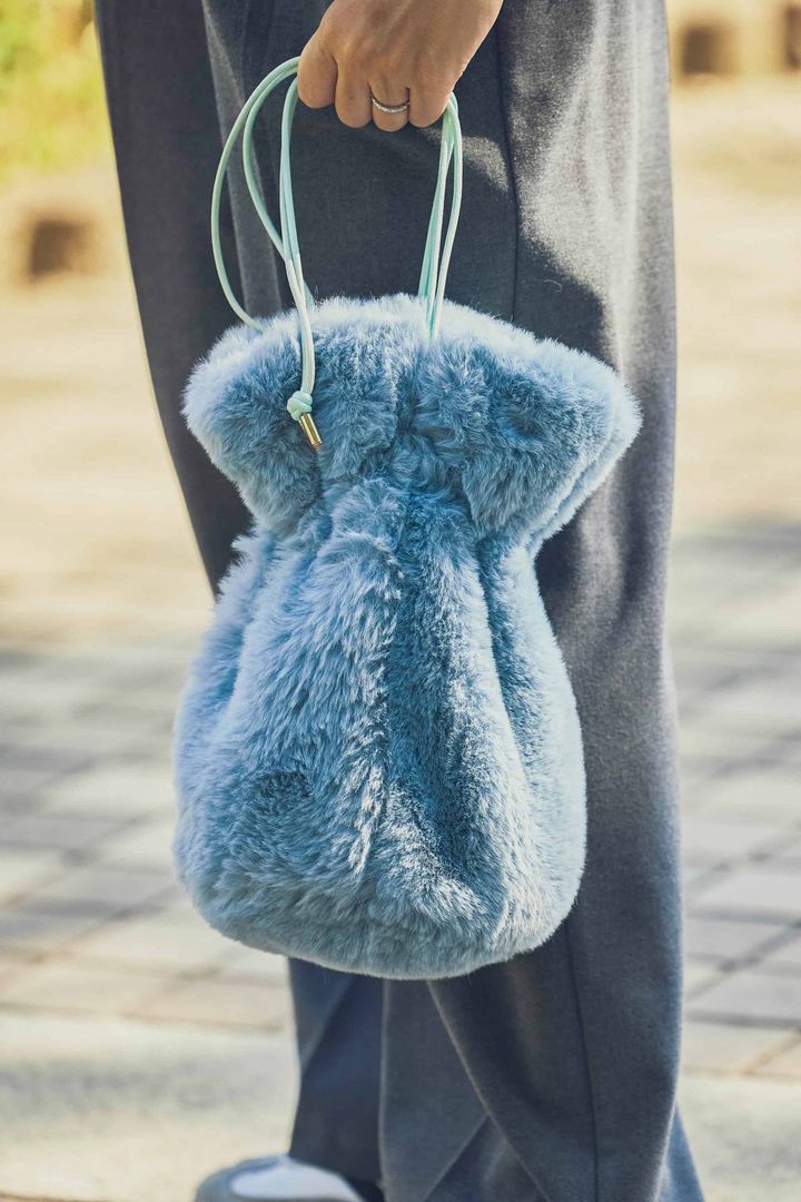 フェザーが映えるワンツー甘ニッシュは、ふわもこバッグのブルーを効かせて