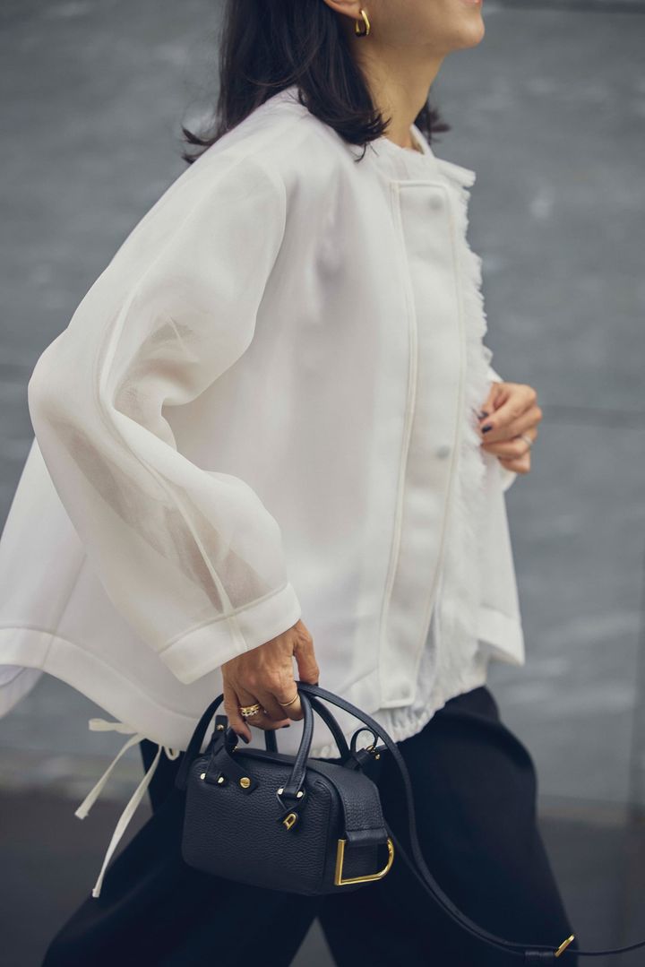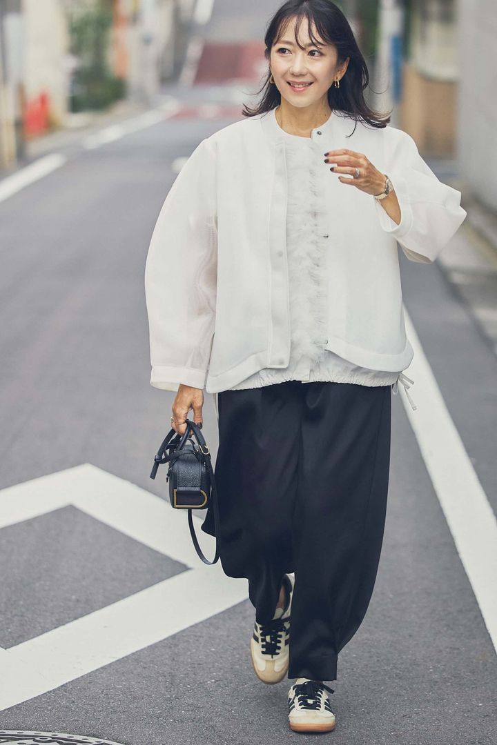 リラクシーなムードで、1枚でこなれた雰囲気になれるシアーブルゾンを主役に、モード感のあるフォルムのブラックパンツを合わせた甘ニッシュコーデ。ブルゾンからはフリルのインナーを覗かせて、甘めのアクセントも忘れません。ブラックのミニバッグは、ピリッと辛口に全体を引き締められるバランサー役に。