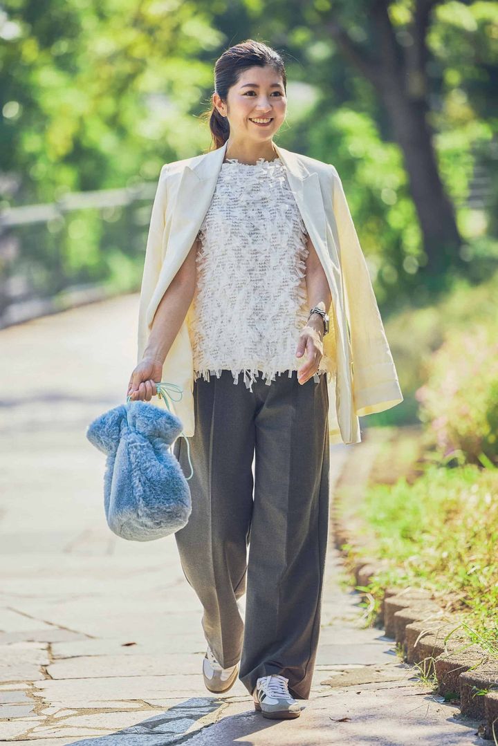 最近ハマっているサウナは、夫婦共通の趣味として足を運ぶことも。そんな夫婦デートの時は、肩肘張らないリラクシーな雰囲気もありつつ、甘めの要素も加えるのが定番コーデです。表情のあるフェザートップスは、甘さと華やかさがあって着映えするのでお気に入りの1枚。素材感的に夏は猛暑で着られなかったので、秋にヘビロテしています。