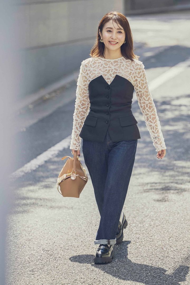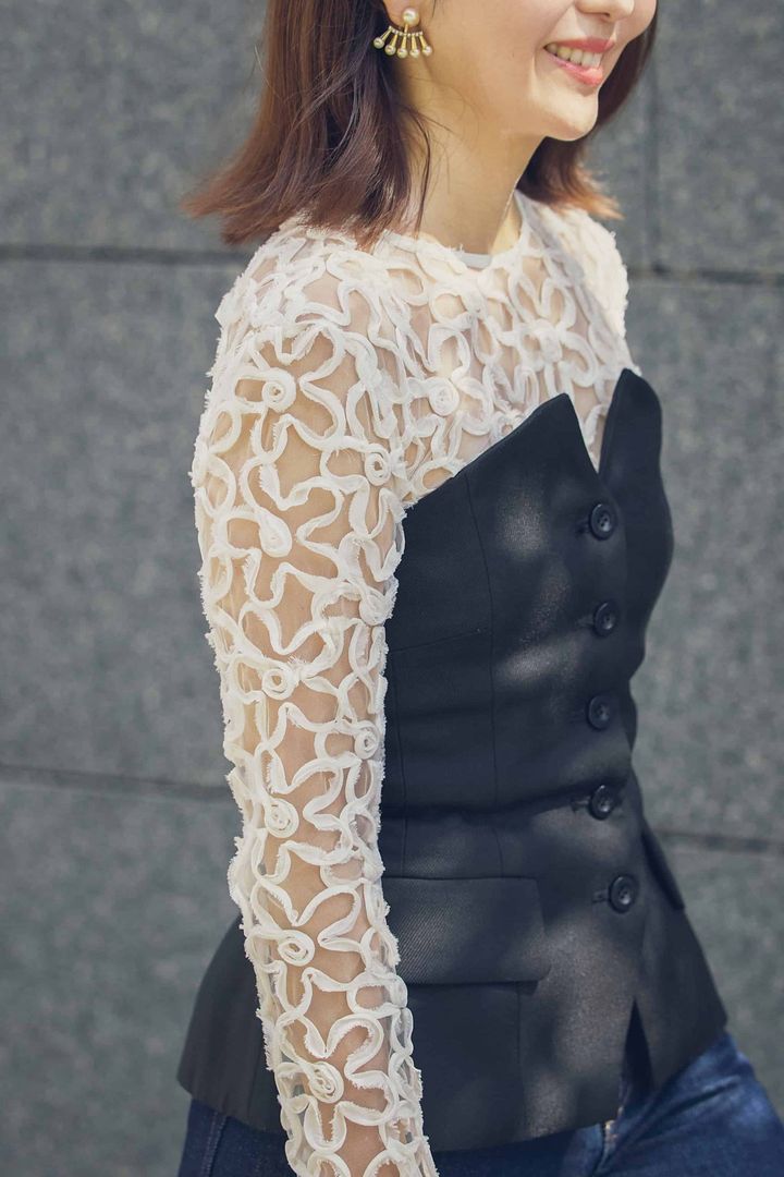 女っぽさが際立つシアーなフラワーレーストップス×ビスチェの組み合わせは、キレイめコーデにも馴染むインディゴデニムでドレスダウン。濃紺デニムは適度にラフさと抜け感を与えつつ、上品さもキープできる万能アイテムです。