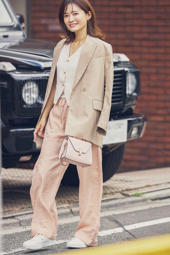 全体的にハンサム度が高めな時は、カラーと素材で甘さを出すのが鉄則。落ち感のあるパンツは、ベビーピンク×とろみ素材を合わせることで、甘いオーラと程よいリラックス感を纏えます。バッグはパンツとピンクのカラーをリンクさせて、さらに柔らかい印象に。キレイめにもマッチする白いシンプルなスニーカーを外し役に、絶妙なニュアンス配色のワントーンでまとめました。