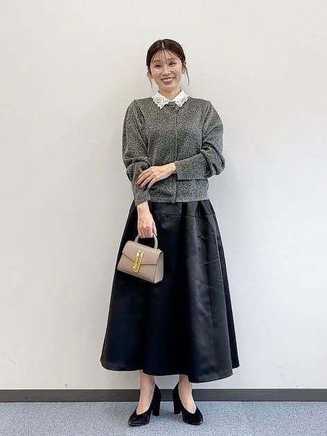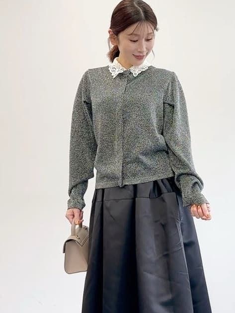 ハイゲージニットに織り込まれたラメがきらめくこちらのニットコーデ。控えめに入った肩のタックがシンプルになりすぎず女性らしさも演出してくれます。キラキラのラメ感強めのグレーカラーが気品ある華やかなスタイルに。忘年会や新年会にも大活躍しそう!