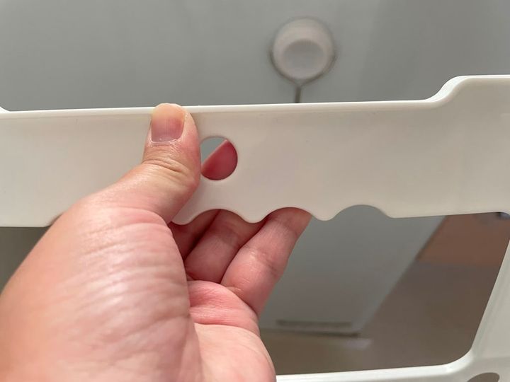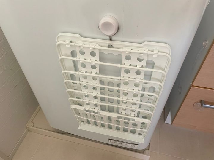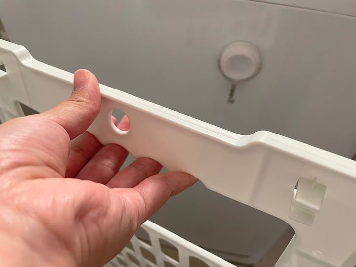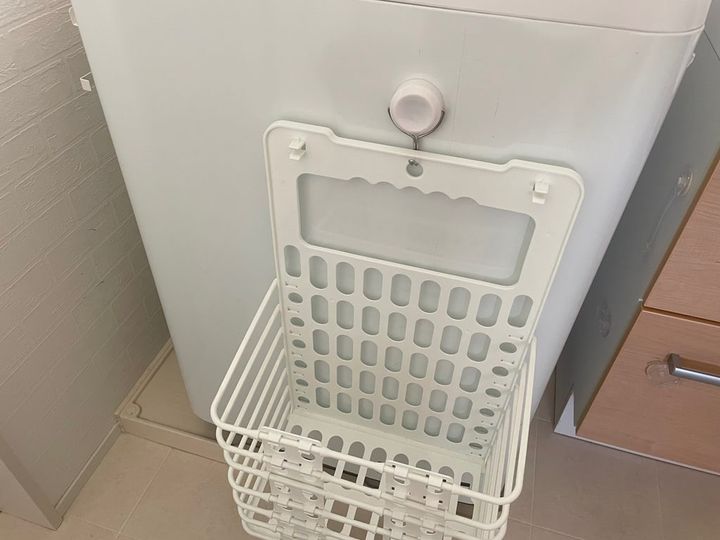 下の画像のように、洗濯機に引っ掛けられます。ランドリーバスケットを床におきたくない人や脱衣所のスペースに余裕がない人にもおすすめです。