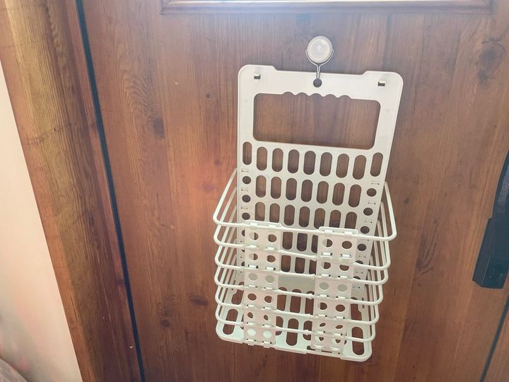 折り畳み式のランドリーバスケットで、フックに吊り下げて使うアイテムです。