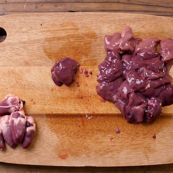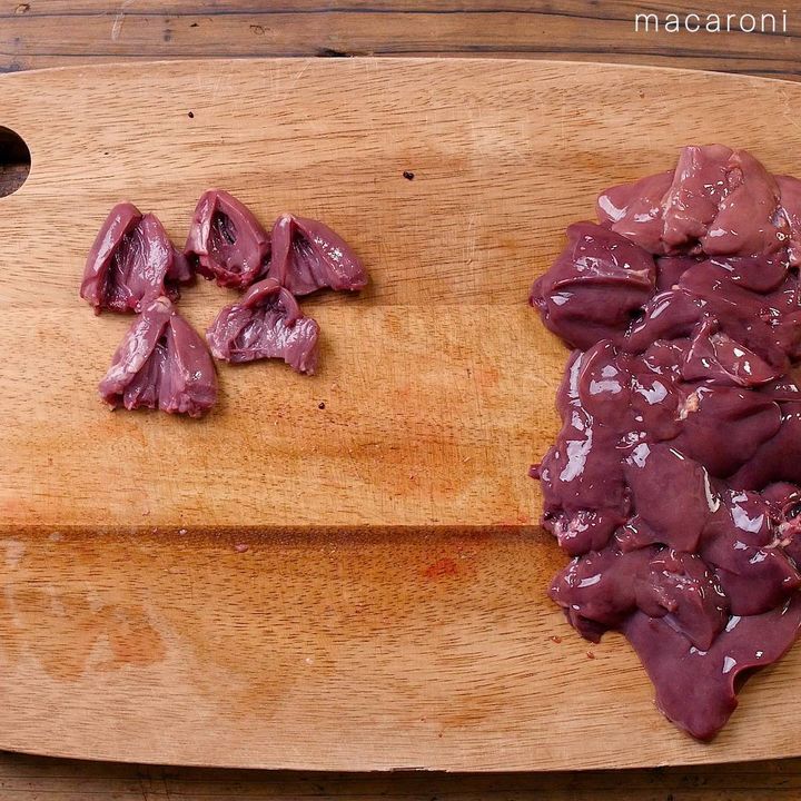 1: 鶏レバーはハツの部分を切り分けます。食べやすい大きさに切り、白い筋や、血の塊を取り除きます。