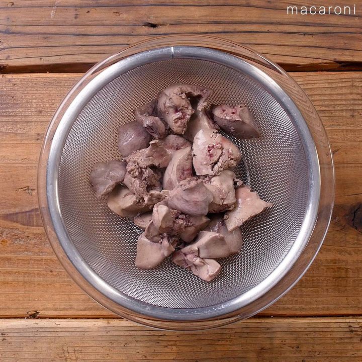 4: 鍋に熱湯(分量外)をわかし、レバーを入れて30秒ほど加熱します。ザルの上に取り出します。