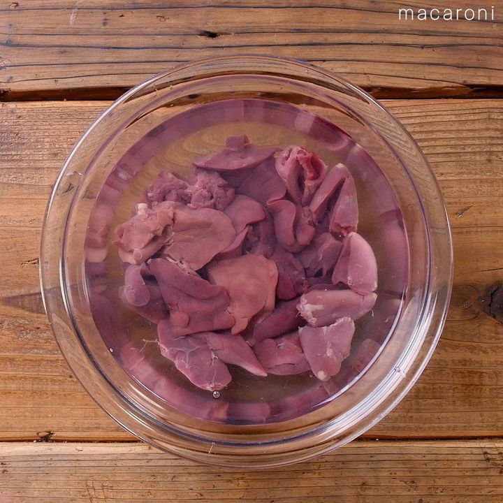 3: 水(分量外)をはったボウルにレバー、ハツを入れ、10~15分ほど水につけます。途中で何度か水を入れ替えながら、血の塊を指でやさしく取り除きます。