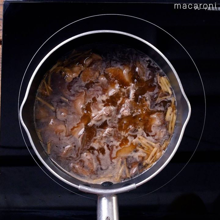 5: 鍋に【調味料】、水、しょうがを入れて沸騰したら④を入れます。再び沸騰してきたら火を弱め、アクを取ります。落とし蓋をして弱火で5分ほど煮ます。