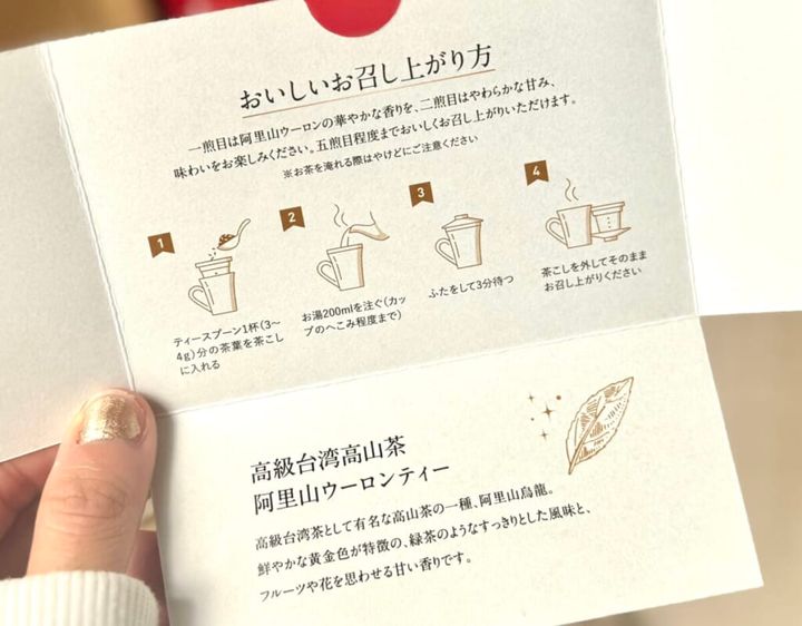 おいしい入れ方も教えてもらえるので、内容を見ながらその通りに淹れ飲んでみましょう♪ 一煎目、二煎目……と異なる飲み心地で、五煎目程度までおいしく飲めるのがまた嬉しい~!