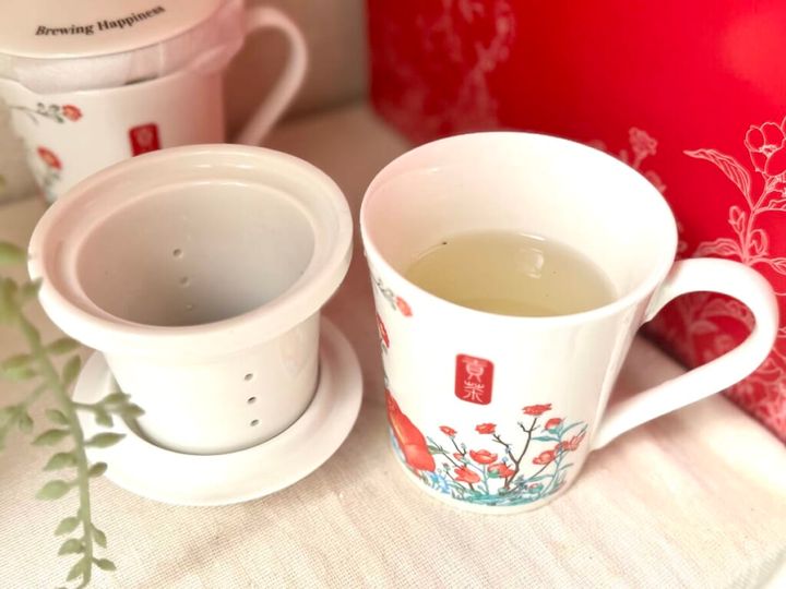 ティースプーンを使い、1杯(3~4g)分の茶葉を茶こしに入れ、カップのへこみ程度までお湯を注ぎます。ふたをして3分待ち、茶こしを外せばそのまま淹れたてのお茶が飲めちゃうんです♪