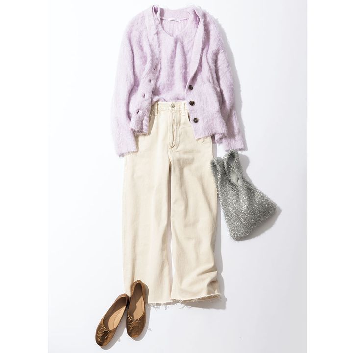 カジュアルなワイドストレートには、甘さたっぷりのふわふわニットを