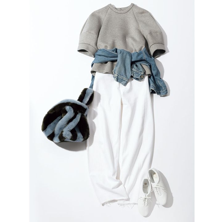 パンツ¥41,800(エーゴールドイー/シチズンズ・オブ・ヒューマニティ)スウェット¥39,600(ソブ/フィルム)腰のジャケット¥49,500(ニードバイヘリテージ/ゲストリスト)バッグ¥27,500(ジャッキー/ジャック・オブ・オール・トレーズ プレスルーム)シューズ¥12,100(クラウン/ジーエムティー)