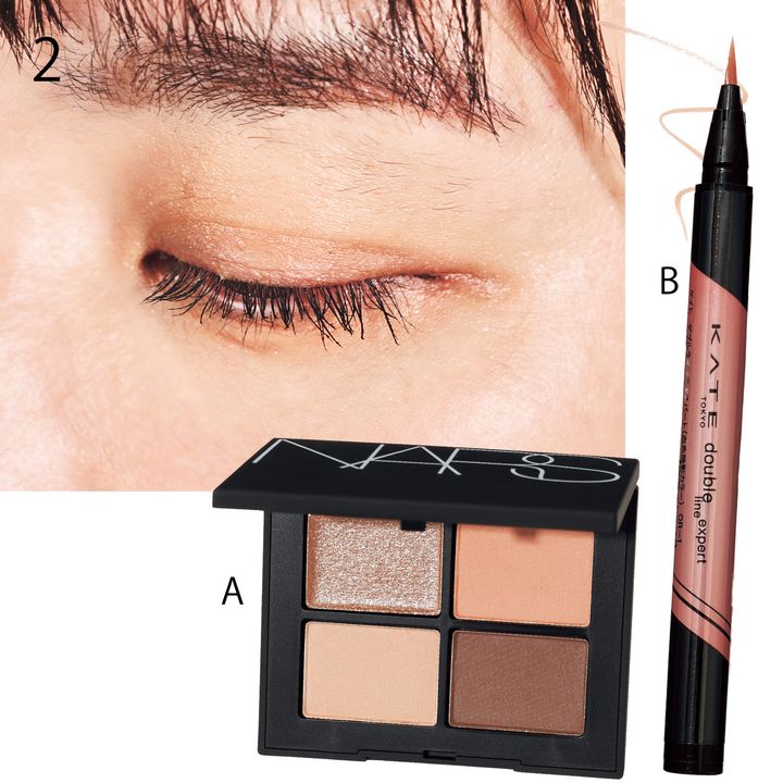 Aのパレットの右上をブラシで二重幅にオン。そのまま涙袋にも広げ、Bのライナーでさっと影を描けば、涙袋が爆誕!