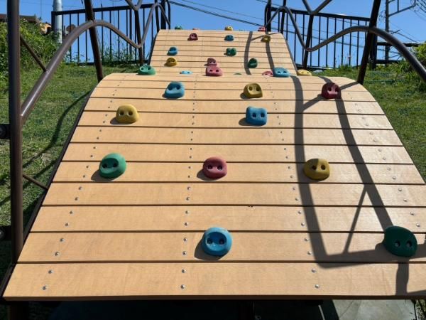 いよいよ、お待ちかねのロッククライミング遊具! 左右に手すりもあるので、ロッククライミング遊具が初めてのお子様でも挑戦しやすそうです。