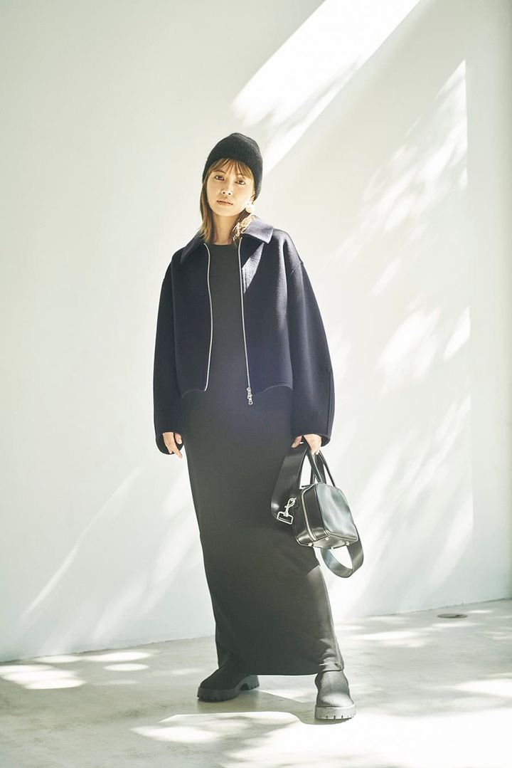 ジャケット¥42,900、ドレス¥17,600、ニットキャップ¥8,800、ピアス¥3,740、バッグ¥16,500、ブーツ¥24,200(全てエミ/エミ ニュウマン新宿店)