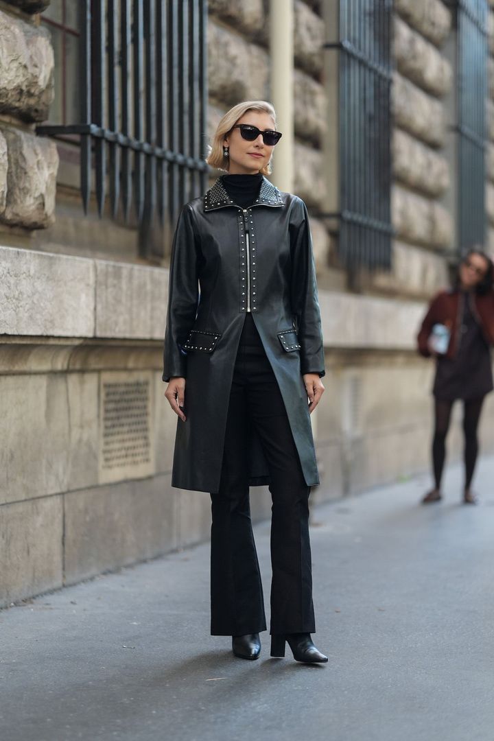 上の写真でジェニーが纏っているのは、エルメス( HERMÈS)のレザーコート。ハードすぎないエレガントなスタッズに加えて、ウエストラインまでのジップ使いが特徴だ。このデザインは、ボトムラインを覆うことなくスッキリと見せることができるため、野暮ったさを解消でき、オール黒の着こなしでもスマートに仕上がる。